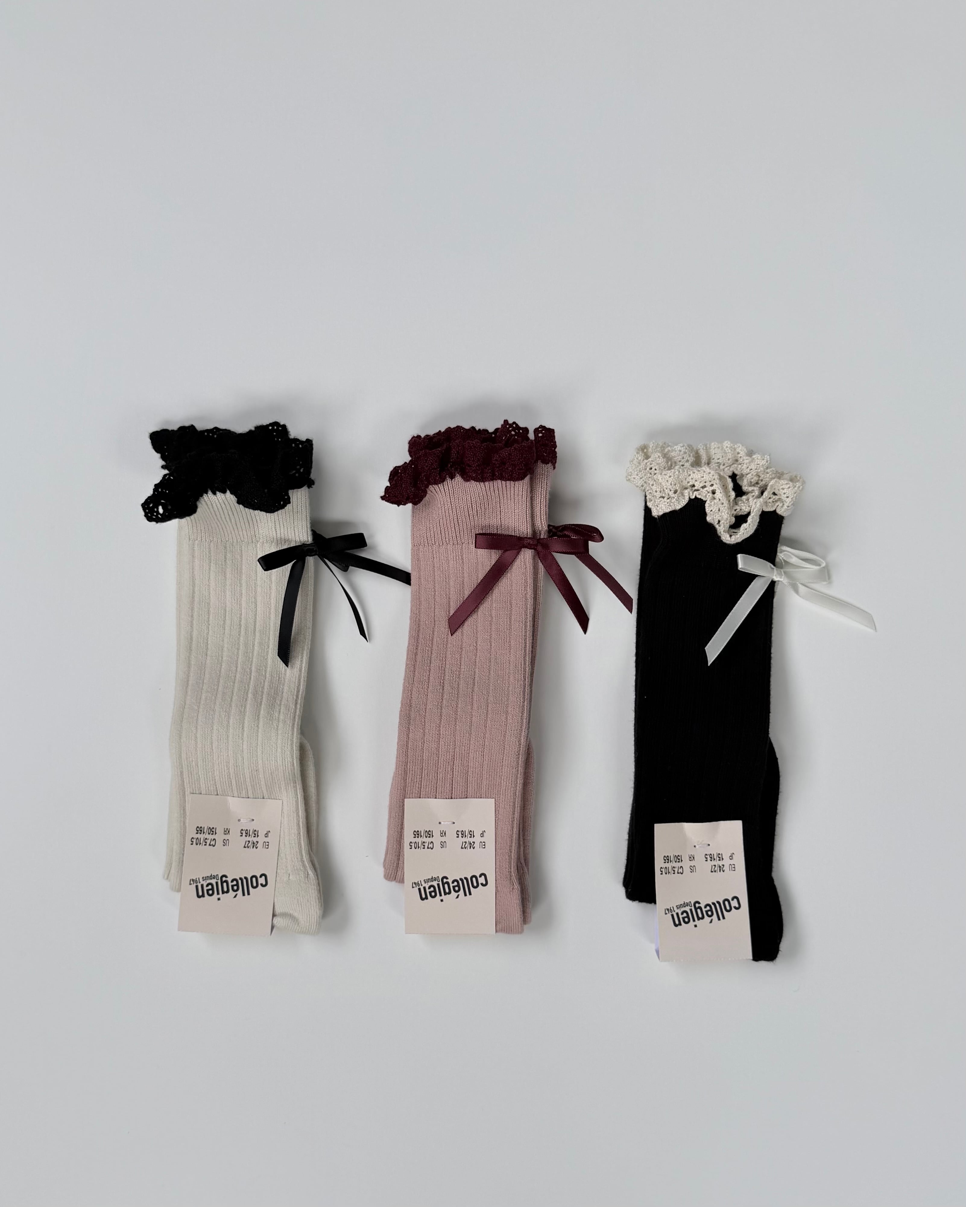 【即納】collegien Domitille Ribbed Knee-high Socks with Lace and Bow - Noir de Charbon